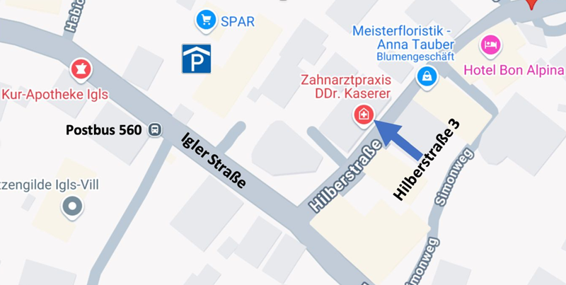 Ausfahrt Innsbruck Mitte – im Kreisverkehr Richtung Igls — durch Vill hindurch immer bergauf — nächster Ort: Igls — in Igls von der Igler Straße gegenüber der Kur-Apotheke Igls links abbiegen zum Spar – Parkmöglichkeiten in der Tiefgarage des Spar — von dort sind es drei Gehminuten bis zur Praxis — nach links auf die Igler Straße — nach ca. 80 m links in die Hilberstraße — zweites Wohngebäude auf der linken Seite — Eingang und Sprechanlage in der Mitte des Gebäudes — im EG ist die Zahnarztpraxis DDr. Kaserer — mit dem Aufzug in das 3.OG fahren — aus dem Aufzug nach rechts — die Praxis ist am Ende des Ganges.